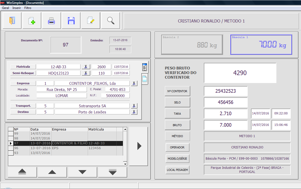 WinSimplex emits the needed document to legally attest the verified gross container weight, with all necessary information like the gross weight and the container identification code, stamp number, the method used and the name of the responsible, besides the date, address of the container weighing place and semi-trailer or truck registration.